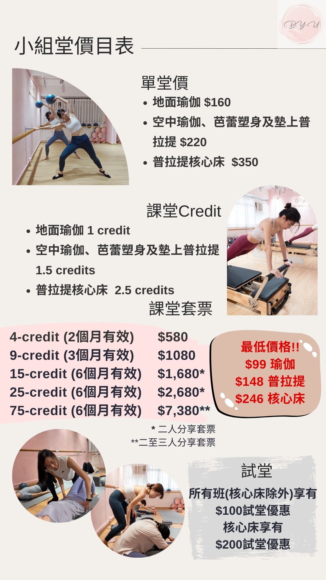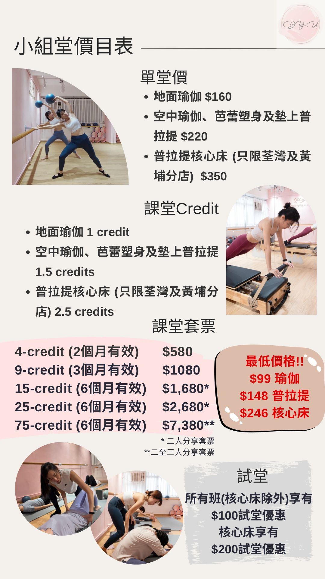 購買Credit即可報名上不同類型嘅課堂滿足所有需要 —— 課堂所需credit數量 ——1 credits 地面瑜珈1.5 credits 地面普拉提1.5 credits 空中瑜珈1.5 credits 芭蕾塑身2.5 credits 核心床—— 課堂價錢計算例子 ——單報讀一堂地面瑜伽,$160購買4個credit,並報讀地面瑜伽,$580/4 =$145購買25個credit,並報讀地面瑜伽,$2860/25 = $107多買多優惠——— 條款及細則 ——— 所有套票有效期均由上第一堂起計算 任何情況下,不設退款/轉讓或延期 如要調堂或取消,請於24小時前whatsapp 63144180作通知,否則會扣除該堂credits
